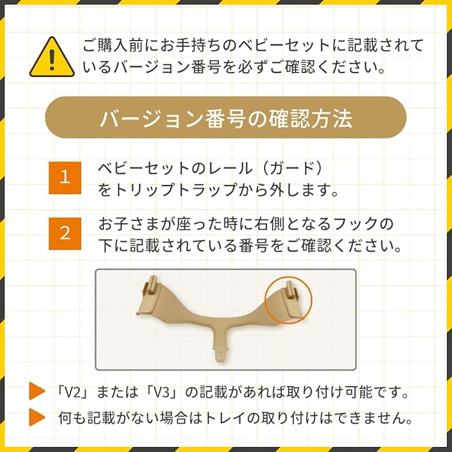 ✅適合確認のお願い 現行のベビーセットに対応しておりますが、安心してお使いいただくため、ご購入前に以下の適合確認をお願いいたします: 【確認方法】 ベビーセットのレールを取り外す 右側フック下部の確認 【 〇 】「V2」または「V3」の表記があれば対応 【 × 】表記なしの場合は非対応 ・旧タイプの木製ベビーセットにはご使用いただけません。