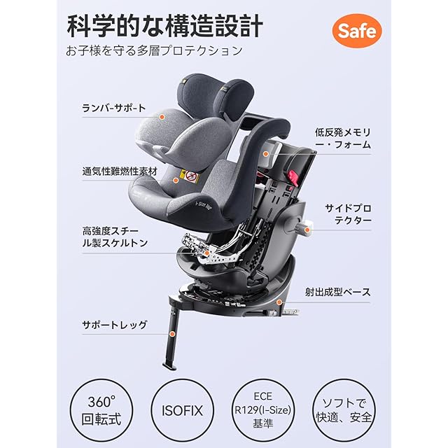 【最新のEU基準】:ECE R129は衝突試験(正面・側面衝突)、ISOFIX固定義務化、身長基準を厳格化した最新規格。これにより子どもの保護性能が大幅に向上しました。
