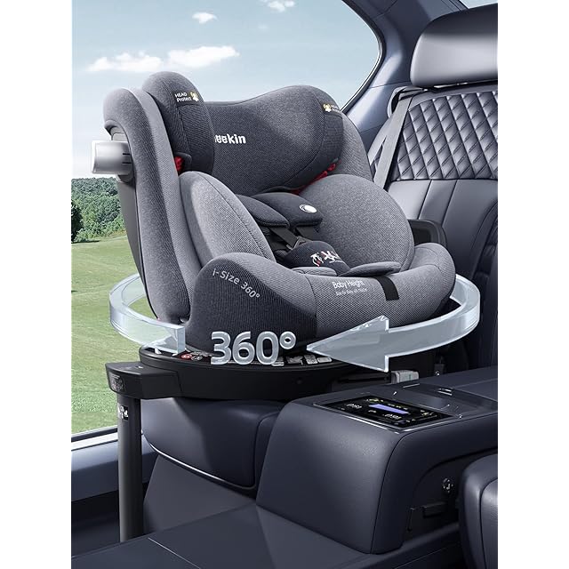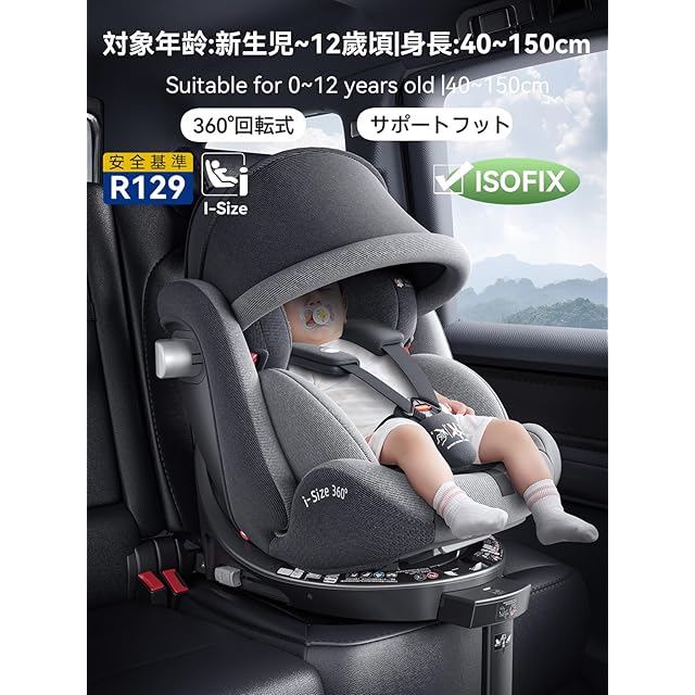 heekin チャイルドシート 360°回転式 ISOFIX+サポートフット固定 角度調整 R129適合 オーニング付き 新生児から12歳までのお子様に最適(グレー)