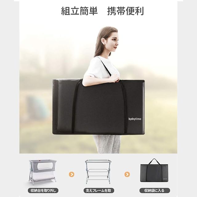 【組立簡単】四歩で折り畳めるから、添い寝ベビーベッドとしてだけではなく、実家に昼寝ベビーベッドが無い場合にラクラク折り畳めて、車で運べます。