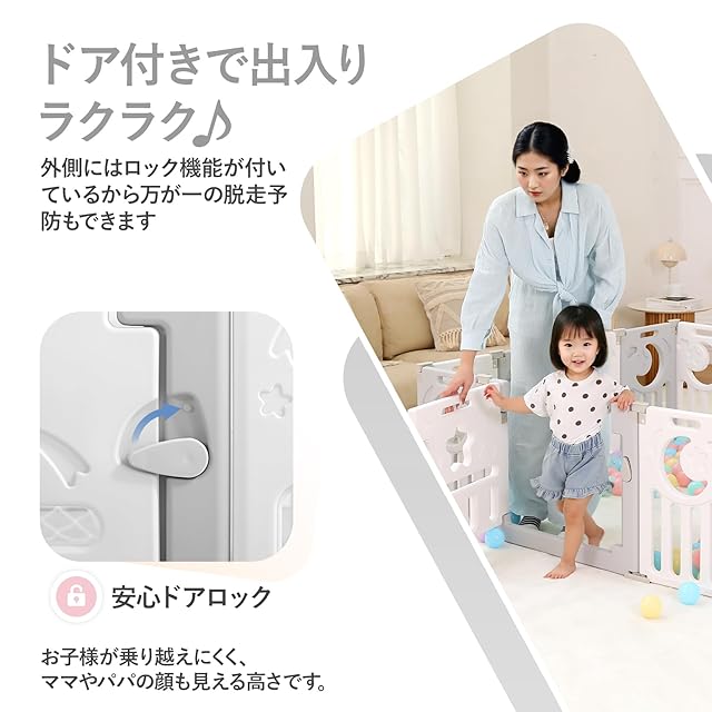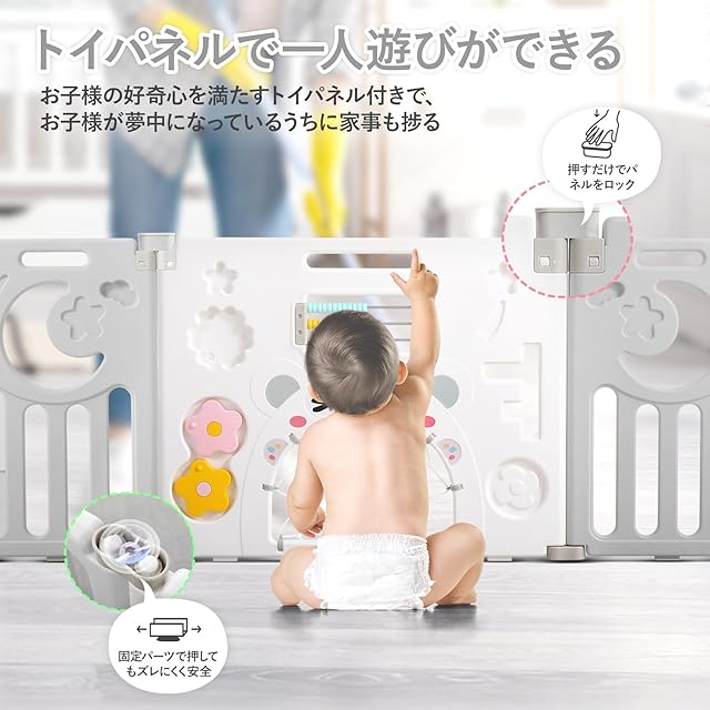 【ドアロック付き扉&おもちゃ付きパネル】ドアパネルの内側から外せないドアロックが付いているので大人も安心です。子どもが勝手に鍵を開けて脱走の心配などもありません。また、おもちゃ付きパネルには赤ちゃんの脳の発達を促し、楽しみを増やします。