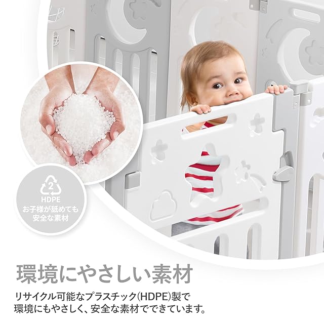 【組み立て&収納カンタン】本ベビー サークルは組み立て時は工具が不要なのでママ1人でも簡単に組み立てることができます。高品質のHDPEプラスチックで作られているので、木製より軽く、持ち運びやすいです。収納の時、上部ジョイントパーツを引き上げ、全てのパネルをジャバラ状に折りたたみます。ドアパネル・トイパネルが先頭と最後にくるように折りたたんでください。