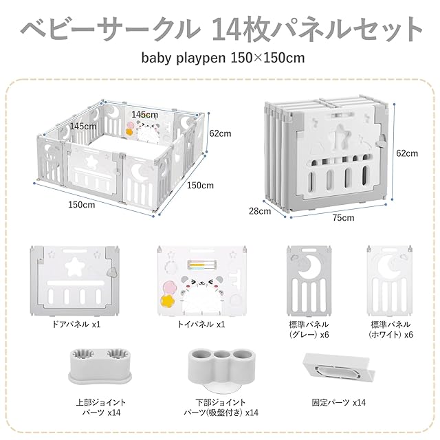 Dripex ベビーサークル 折りたたみ おもちゃパネル 大きめ 赤ちゃん サークル ドア付き ベビーゲート 高さ60cm コンパクト ベビーフェンス ハイタイプ プラスチック 出産祝い ペット用 プレゼント 150×150cm 14枚セット (グレー×ホワイト)