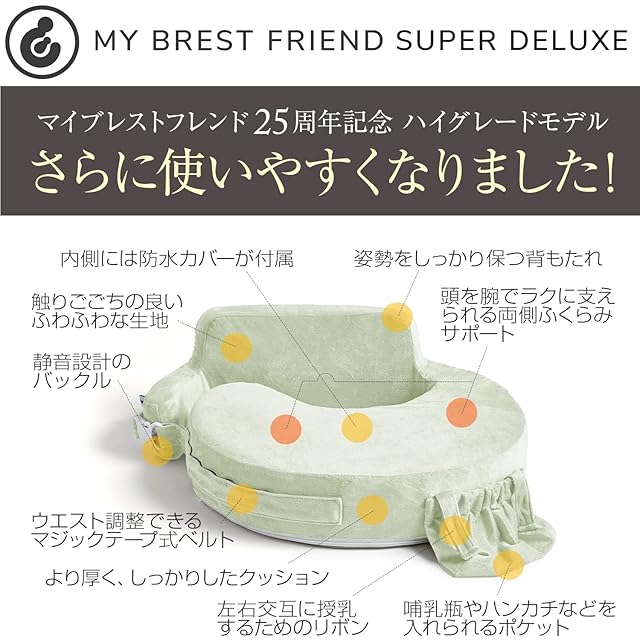25周年を記念した「マイブレストフレンド・スーパーデラックス」は、 背中のクッションもさらに大きく厚くなり、腰をサポートして、ママが正しい位置、姿勢で授乳しやすいようになっています。フロントクッションの高さと厚みも増すことによって、簡単に赤ちゃんを胸に近づけて、ママが体を曲げたり、腰をかがめたりする必要がないようにします。ママだけでなく赤ちゃんも快適です。