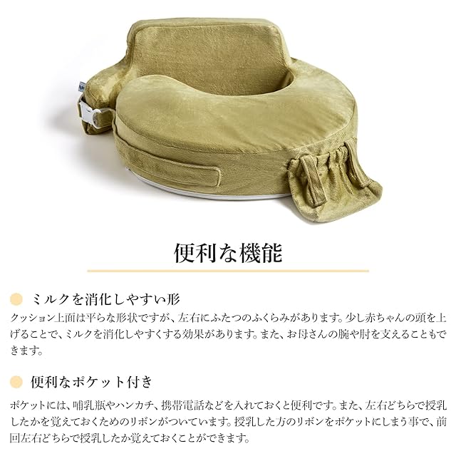 「バックル」は音をたてずに片手でサイズ調整と取り外しができるので、おなかが一杯で寝てしまった赤ちゃんを起こすこともありません。 「ポケット」には哺乳瓶やタオルなどが入ります。必要な時に手が届きとても便利です。 ポケットについている2本のリボンは、授乳した方のリボンをポケットの中に入れておいて左右どちらで授乳をしたか覚えておくことができます。