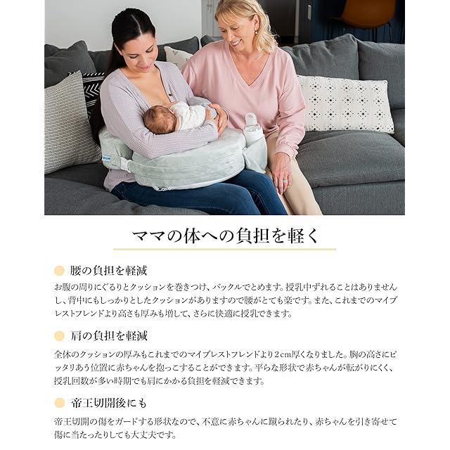 世界中で愛され続けている「マイブレストフレンド」は、25周年を迎えました。 授乳するママの快適さ、理想的なポジショニング、赤ちゃんの心地よさのために、さらに改良しました。 ママの背中、首、腕の負担を軽くするために、授乳中のより良い姿勢と快適さを追求しました。 マイブレストフレンドの特徴は何と言っても、体をぐるりとサポートするD型クッション。ベルトでしっかり固定して、ずれることがありません。
