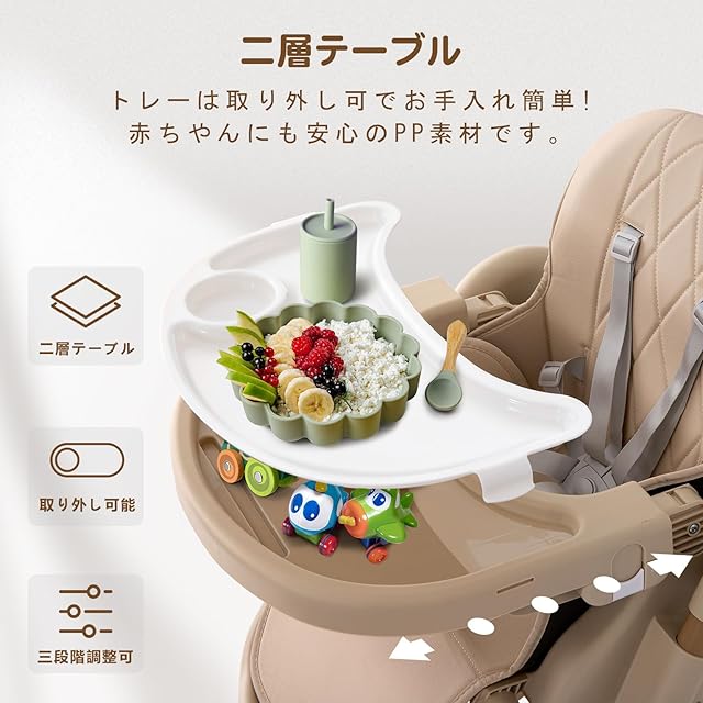【食事トレー3段調節】二層の食事トレイ設計は、一層は食事用、もう一層は遊び用で、衛生面でもより安心です。テーブルは前後にスライドさせることで、スムーズに食事ができ、食べこぼしが床や座面にも落ちにくくなります。また、子供のニーズに応じて取り外すことも可能です。