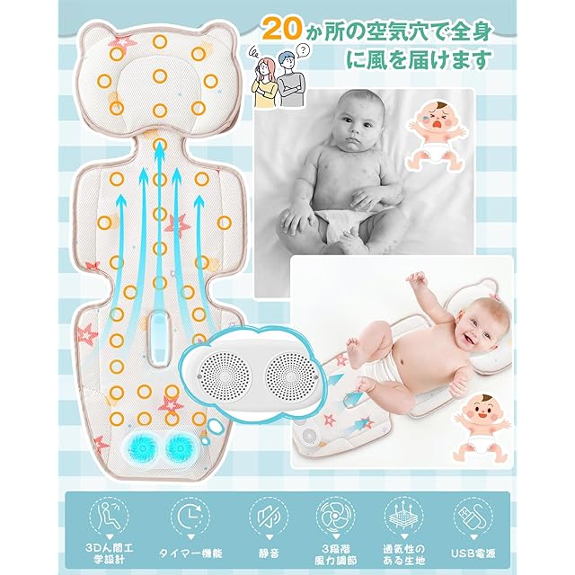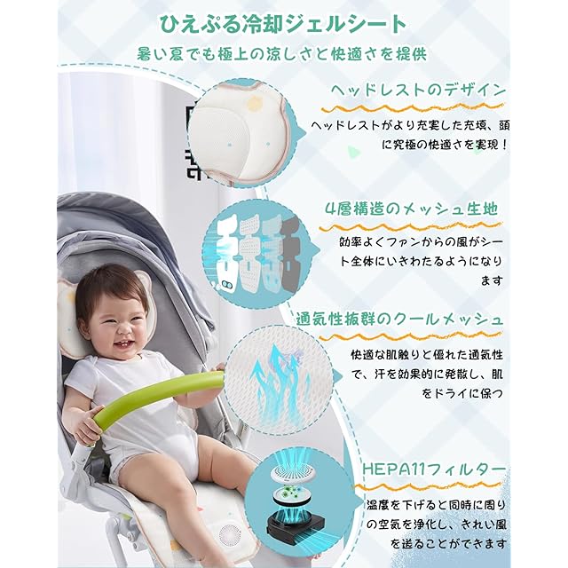 【送風機能付きベビーカーシート】ベビーカーでの暑さ・ムレを防ぐ,ひんやりベビーカーシートが新登場!シート下部の2つのファンを備え、涼しい空気を取り込み、風がシート全体に行き渡ります。ベビーカーの乗り心地をさらさら快適に。通気性とクッション性を兼ね備えた4層構造3Dハニカムメッシュ構造で効率よくファンからの風がシート全体にいきわたるようになります。赤ちゃんを涼しく保ち、特に熱がこもりがちな、背中とお尻の部分に風が当たります。
