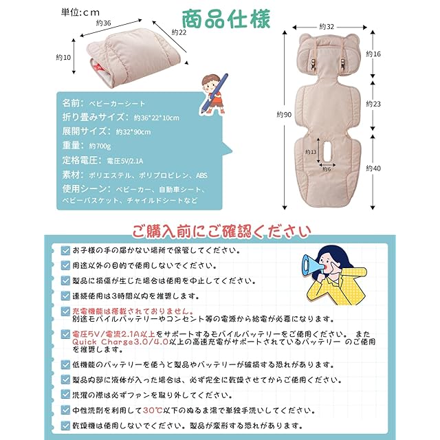 【取り付けやすい&安心設計】このチャイルドシート冷却パッドは簡単で軽量で、取り外し可能な設計で清潔に便利です。このシートクッションはUSB給電ので、モバイルバッテリー(別途用意)など、ほとんどのUSB電源装置などと接続して使用します。お子様にも安心の設計、シート部分内部には電気部品は含まれていません。ですので、感電のリスクもありません。ファンはカバーされており、万が一ファンをお子様が触ってしまっても、怪我を防ぐ設計となっております。