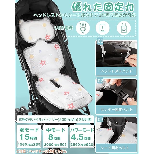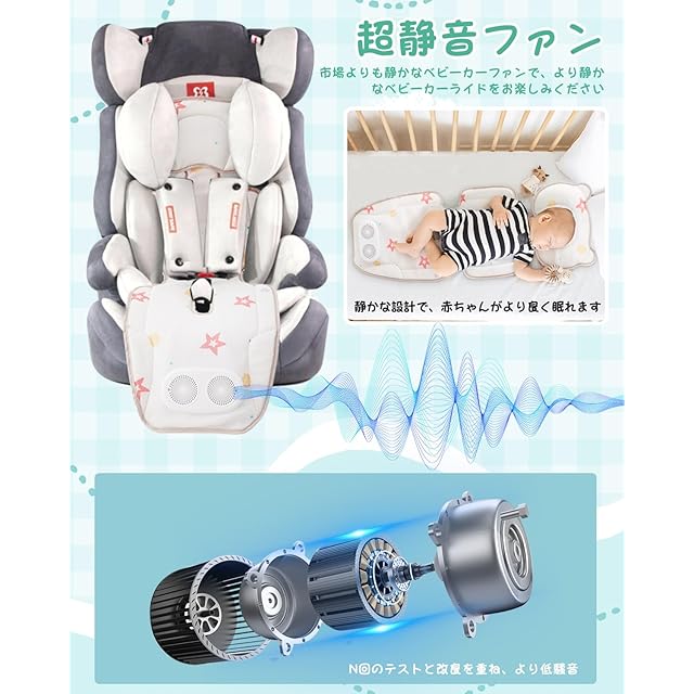 【追加ヘッドレスト付き&赤ちゃんの肌にやさしい素材】ベビーカーシート 冷感 送風はは、取り外し可能なヘッドレストが付いており、追加の快適さとサポートを提供するだけでなく、風を遮る効果もあり、赤ちゃんの頭部を直接風から守ります。赤ちゃんの成長段階や好みに応じて自由に調整または取り外すことができます。生地は通気性の良いメッシュ素材を使用し、赤ちゃんの敏感な肌にやさしい。しっかりと包まれた縁は丈夫で、 厚さと硬度がちょうどよく、赤ちゃんに快適感を提供し、同時に背中の乾燥を維持します。
