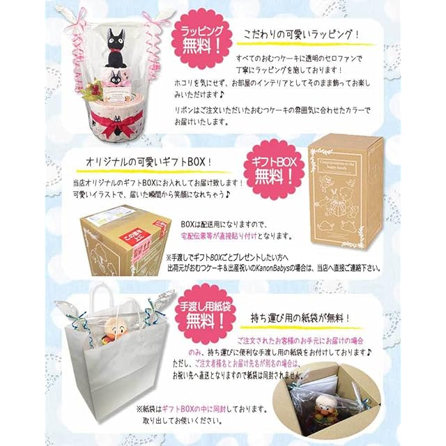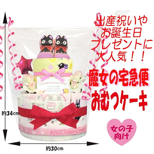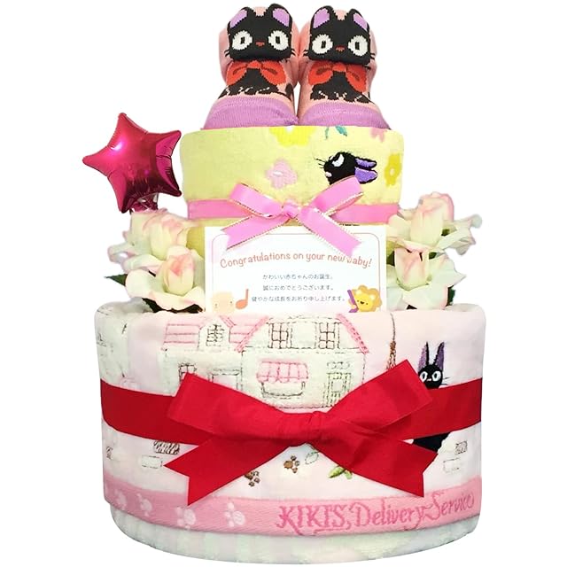 出産祝いに人気のジジのおむつケーキ:スタジオジブリの愛されキャラクターのジジがデザインされたおむつケーキは、赤ちゃんの出産祝いとして人気が高いです。特に女の子の誕生を祝う出産祝いギフトとしておむつケーキは選ばれています。