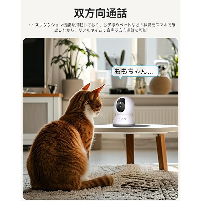 【PTZ首振り・双方向通話・多用途ホームカメラ】❶水平方向360 °、垂直方向110 °のPTZ機能を付きます。アプリで遠隔から留守番カメラの向きを操作でき、いつでもどこでもご家族やおペットを見守ることができます。また、4倍デジタルズームを搭載して、必要に応じてズームアップして細部を確認できます。❷アプリのリアルタイムで音声双方向通話も可能です。猫や犬の監視用・お年寄りの介護用やオフィス用など様々なシーンで大活躍です。