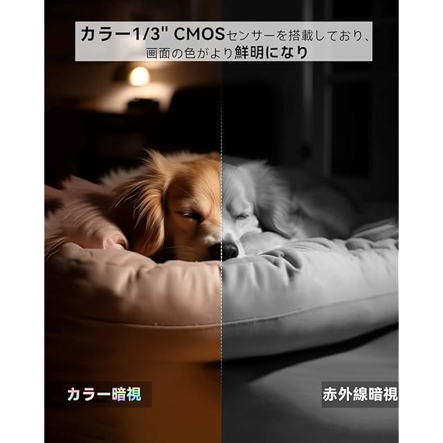 【カラー暗視・300万画素】❶4 mmレンズとカラー1/3" CMOSセンサーを搭載しており、300万画素(2304x1296)を実現します。暗闇でも画面の色が鮮明になります。暗視距離最大12 mで、夜間にもご家族やおペットの様子を確認できます。❷監視カメラは暗号化技術を採用して、記録したビデオはお客様だけアクセスすることができます。データの転送がより安全になり、ユーザーのプライバシーを保護します。