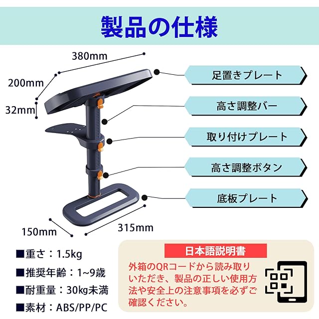 【成長に合わせて調整可能!】 高さは0.7cm刻みで最大54cm、角度は15度単位で最大135度まで調整可能です。 1歳から9歳までの幅広い年齢範囲で、お子様の成長に合わせて足置きの位置を調整でき、長期間使用可能です。