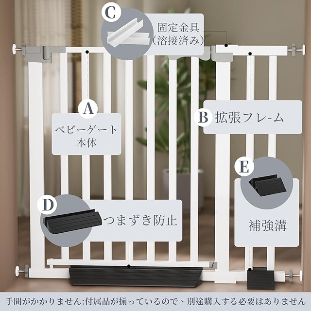 【幅調整自由&全配件付属:69-153cm柔軟対応】拡張フレーム(7-70cm) 付属で階段上・キッチン入口など幅153cmまで対応。他社で別売の「段差スロープ」「補強溝」「溶接固定金具」を全付属!壁傷防止パッド(別売)やY型ボルト(別売)で柱状階段も設置可。