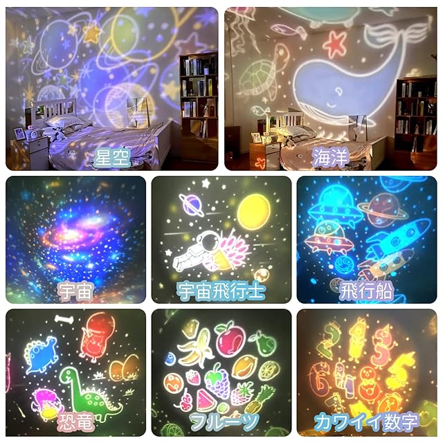 ✨【夢のような美しく幻想的な雰囲気】スタープロジェクターライトはブルー・オレンジ・ホワイトの3色を組み合わせて、オーロラのグラデーションのように色どります。ワンタッチ・ワンボタンで360度回転できるので、部屋全体がきらめく美しい幻想空間に早変わり。ଘ(੭ˊ꒳ˋ)੭✧ 28種類の投影フィルムをお子さんの好みに設置してください。星空を散歩したり、海の生き物たちを一緒に泳いだりと、まるで夢の中にいるような幻想体験を親子一緒に楽しめます。ღ(๑╯◡╰๑ღ外出がなかなか難しい時期でも、お家で簡単にプラネタリウムのような空間を満喫できます。