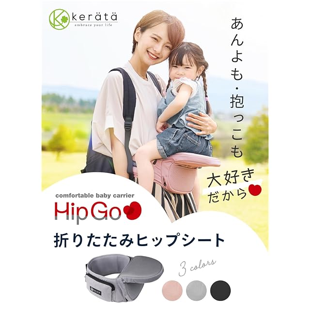 ケラッタのヒップシートから、遂に折り畳み式が登場しました!その名もHipGo。ママと赤ちゃんが楽しくお出かけが出来るようにという思いを込め、負担軽減&快適構造のヒップシートを作りました。HipGoの使い方はとってもシンプル。気軽に使えるので、ちょっとしたお出掛けにもおすすめです。コンパクトに折りたため、専用の袋もついているので、収納や持ち運びに◎。本体には収納ポケットが2カ所付いており、スマホやハンカチなど、ちょっとしたものを入れておくことができます。HipGoはサイズ調整が出来るので、ママパパ2人でお使い頂くことができます。