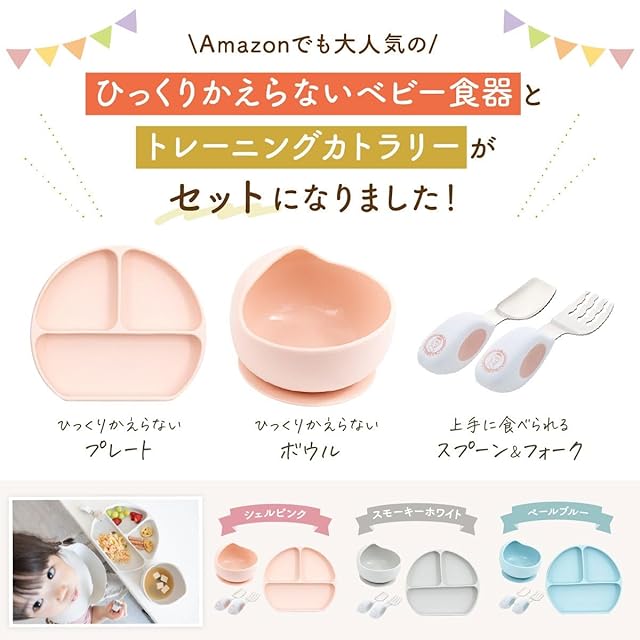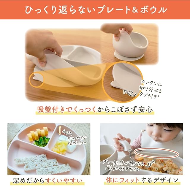 【ロングセラーのひっくりかえらないベビー食器】 プレートとボウルは、吸盤でテーブルに固定でき、ひっくり返すことなくお食事可能。 底が深いからトロっとしたものも上手に食べられます。