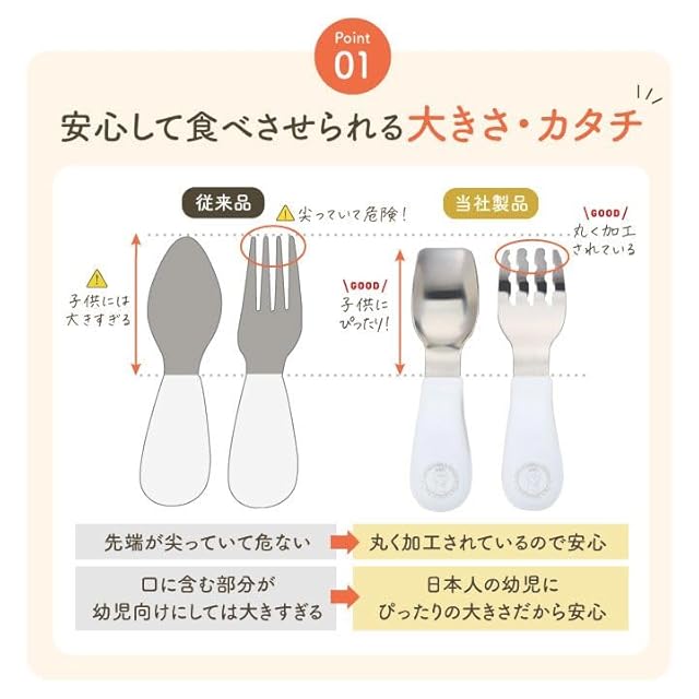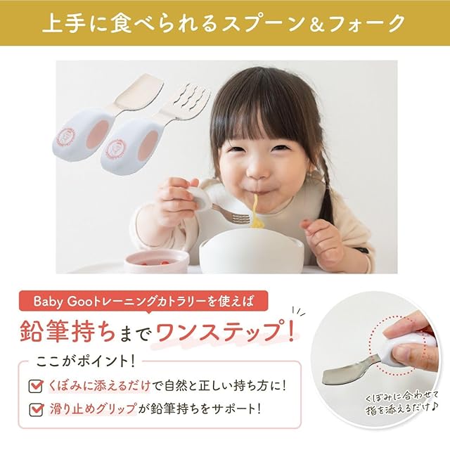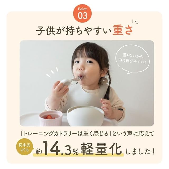 【自分で食べたくなるトレーニングカトラリー】 スプーン、フォークは赤ちゃんが本当に使いやすい形を徹底的に追及し、人間工学に基づいて設計。 手元は持ちやすい大きさで滑り止めのグリップ付き。 先端部分は1歳~3歳のお口サイズに合わせた“ちょうどよいサイズ感”に。