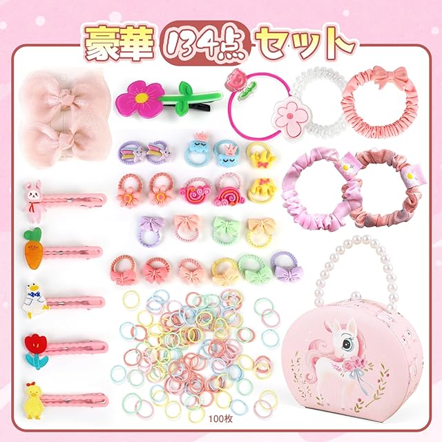 【豪華134点ヘアアクセサリーセット】リボンや花柄など、可愛らしいヘアピンやヘアゴムが134点も入っています。子供たちに人気のあるデザインを多数揃えており、豊富な選択肢からお気に入りを見つけることができます。様々な組み合わせを楽しめるので、ヘアゴムが足りないと悩むこともありません。