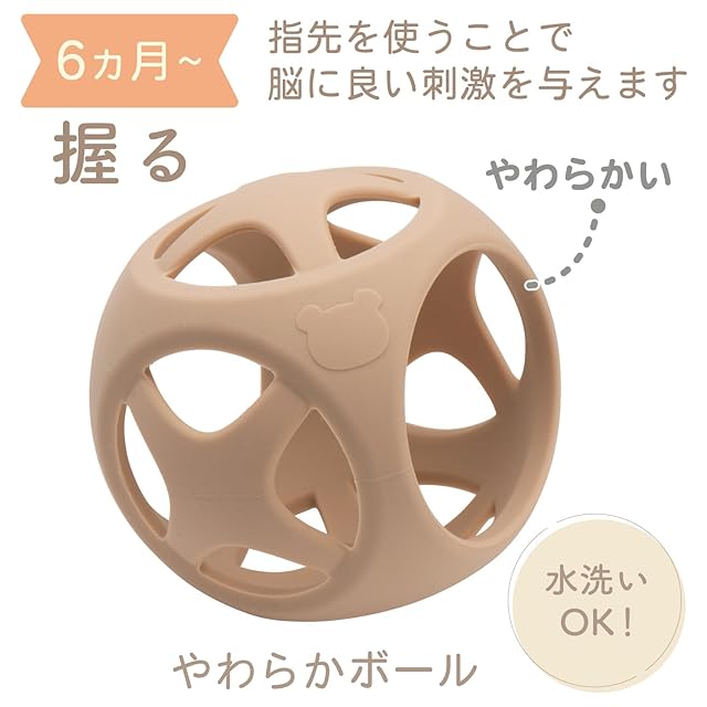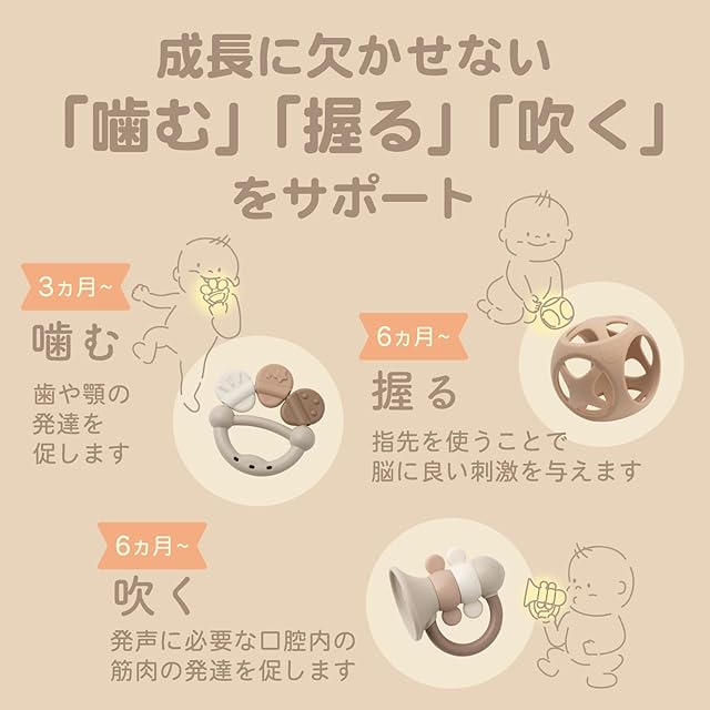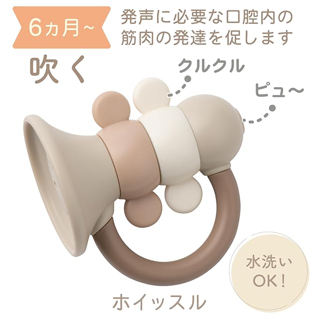 【セット内容2】やわらかボール:『握る』動作は、手の運動をサポートし、脳にいい刺激を与えます。水洗い可能です。/ホイッスル:『吹く』動作は発声に必要な口腔内の筋肉の発達を促します。水洗い可能です。