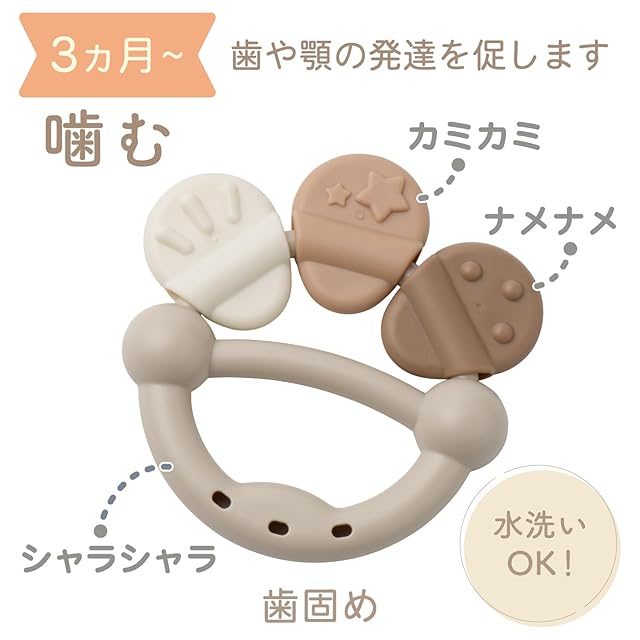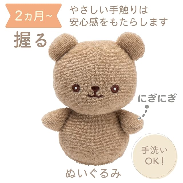 【セット内容1】くまのぬいぐるみ:タオル生地だから肌に優しく、赤ちゃんのよだれも吸収してくれます。その後は水洗いできるので清潔を保てます。/歯固め:『噛む』動作は歯や顎の発達を促すと共に、歯の生え始めの不快感を和らげます。水で丸洗いできるからその後も清潔を保てます。