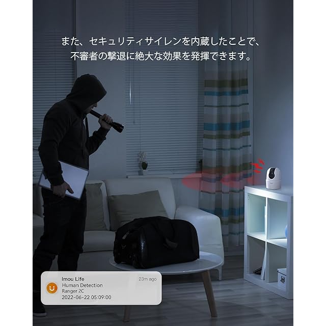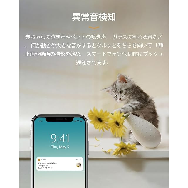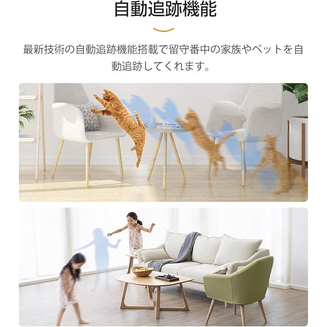AI検知&アラート通知:この屋内防犯カメラは3つのAI検知機能を搭載しています:(1)動体検知をオンにした後、動く物体が視界に入ると、自動的に追跡して録画し、スマホに通知を送信します。ペット用のカメラとして非常に適しています。猫や犬などのペットカメラ。 (2)人型検出をオンにすると、人型のみが検出されるようになり、ペットの動きによる繰り返しの通知に悩まされることがなくなります。 (3)ベビーモニターとして、異常音検知をオンにした後、音センサーを使用して子供の泣き声やその他の異常音を捕捉し、すぐに通知を受け取り、リアルタイム映像を確認できます。