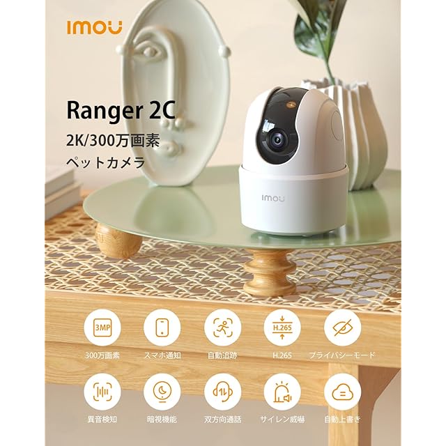 【300万画素・自動追尾】Imou ペットカメラ 監視カメラ 見守りカメラ 24時間録画 双方向通話 接続簡単 防犯カメラ 室内 留守番カメラ 360度カメラ 動体検知 暗視撮影 遠隔操作 SDカード/クラウドストレージ/NVR ネットワークカメラ ベビーモニター 高齢者/子供介護 ホームカメラ Alexa対応 WiFi 2.4GHz Ranger 2C