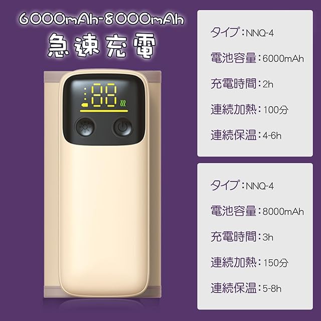 【USB給電式】5V/2Aの定電圧入力に対応し、約40℃ぐらい保温できます。ベビーを連れて出かけた際におススメします。電源と接続した際にミルクを加熱できます。6000mAh-8000mAh大容量バッテリー内蔵します