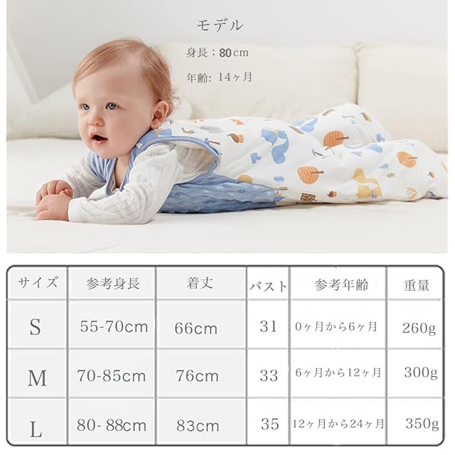 サイズ S、M、L 着丈:66cm、76cm、83cm バスト:31cm、33cm、35cm 参考年齢:0ヶ月から6ヶ月、6ヶ月から12ヶ月、12ヶ月から24ヶ月