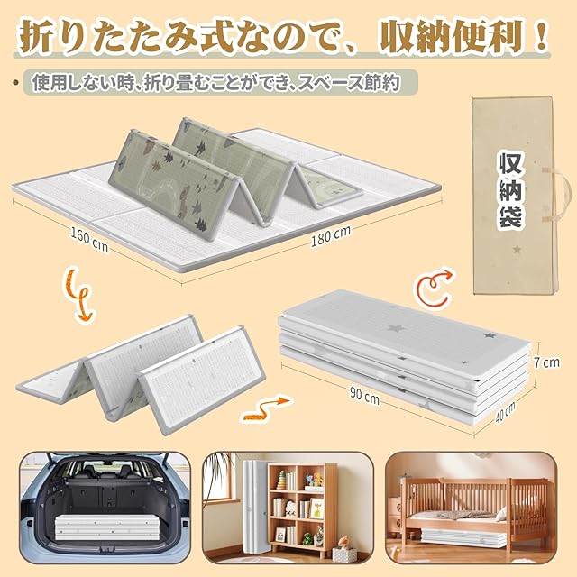 「両面デザイン・折りたたみ」:リビングでも子ども部屋でも選びやすいプレイマット。両面で色/柄違いなのも魅力、汚れてもひっくり返して新品気分!お部屋のインテリアに合うマットをお選びください。折りたたみ式で、お掃除途中や使わない時はコンパクトに収納、また、収納袋が付属しており、持ち運びにも便利です。
