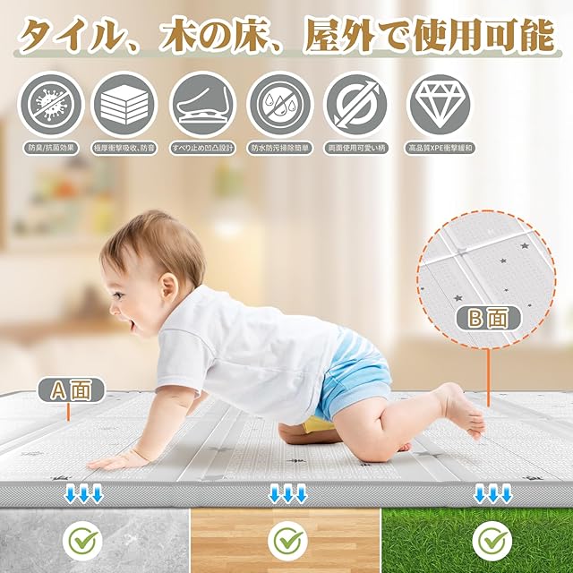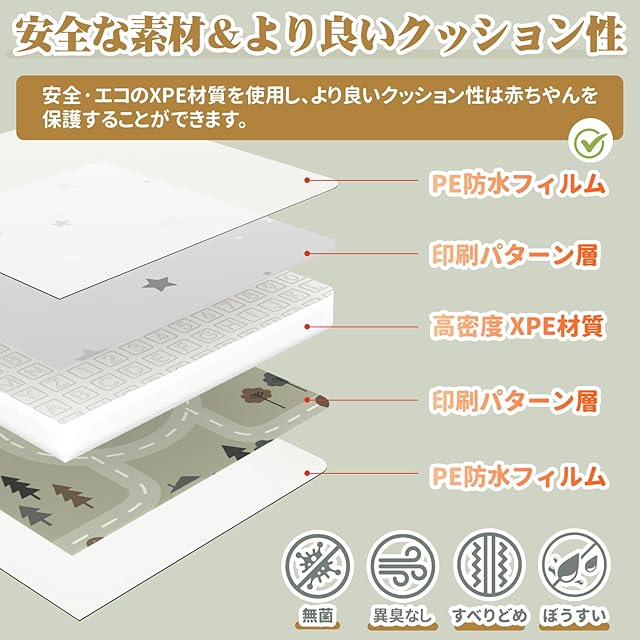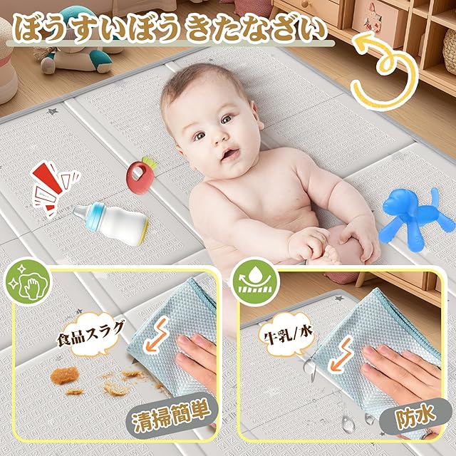 「滑り止め・防水・防汚効果」:赤ちゃんマットの表面にこまやかなエンボス加工を施しています。子供が走っても滑りにくいので安心です。防水性・防污性に優れた素材なので、食べこぼしや液体もサッとひと拭くだけお手入れ簡単!※汚れや水分を長時間放置すると、カビやシミ、におい移りの原因となります。