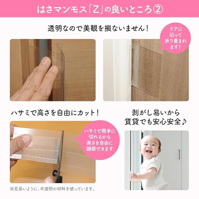 【はさマンモスのメリット】ドアへの指はさみ事故を防止します。押し圧力に強いトラス構造だから、指がドアの隙間に入り込むのを強力に防ぎます。透明だから、美観を損ないません。