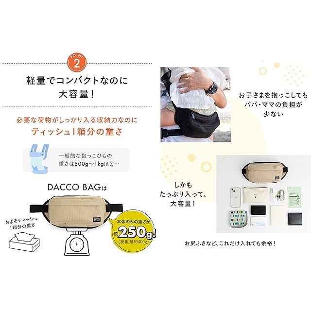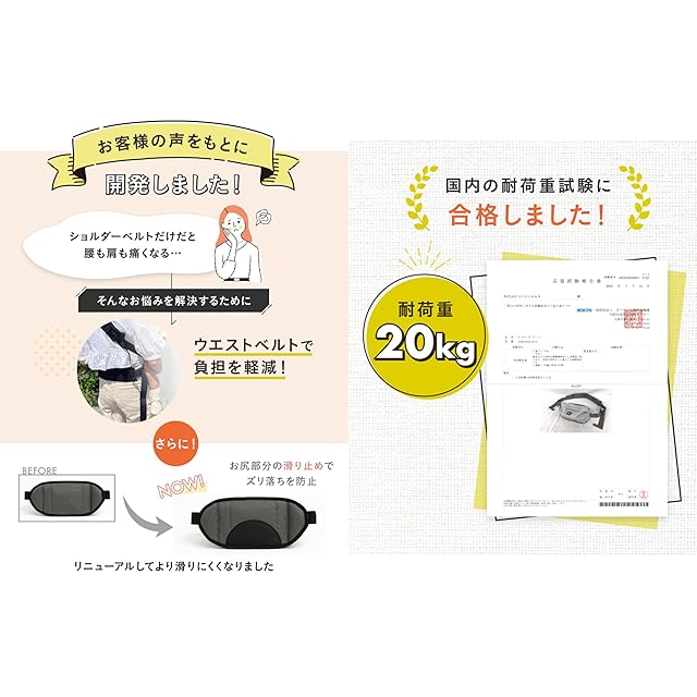 【補助ベルトで負担を軽減】ショルダーベルトだけでは肩が疲れてしまうというお客様の声を反映し、補助ベルトを追加しております。肩と腰の2点で支えることができるため、長時間の抱っこが可能になり、ベルトが体に食い込む心配もございません。