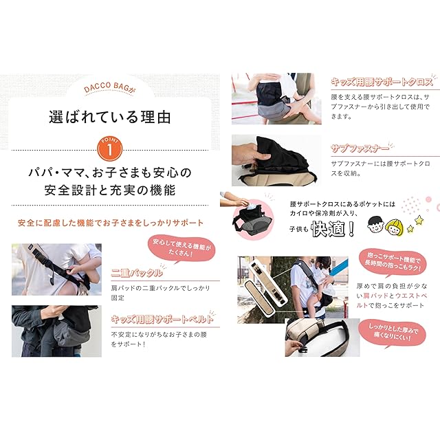 【お子様も安心できる設計】お子様が安心して快適に座れるよう広めの座面に滑り止め加工を施しております。さらに、肩パッドの2重バックルがあるためベルトが外れるリスクもなく、子供の腰を支えてくれるキッズ用サポートベルトとキッズ用腰サポートクロスも付随しているため使用シーンに合わせて安心してご利用できます。