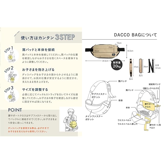 【適応年齢】6ヶ月~5歳頃(※腰が据わったお子様が対象)【耐荷重】20kg【製品サイズ】本体:縦16.5cm×横34.5cm 肩パッド:縦8cm×横47cm 腰パッド:縦9cm×横39cm ベルト:全長121cm ※商品によってはサイズに多少の誤差がある場合がございます。