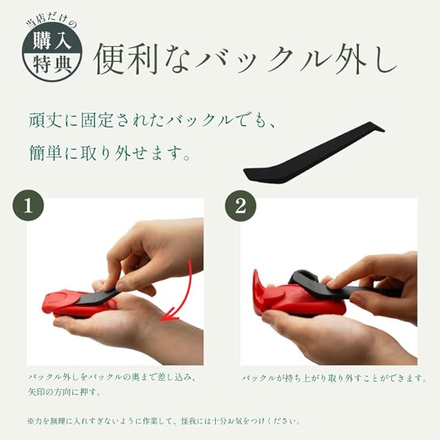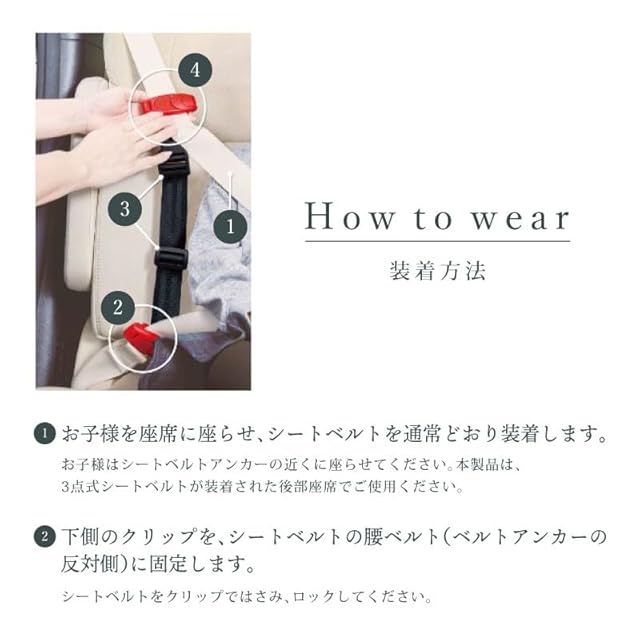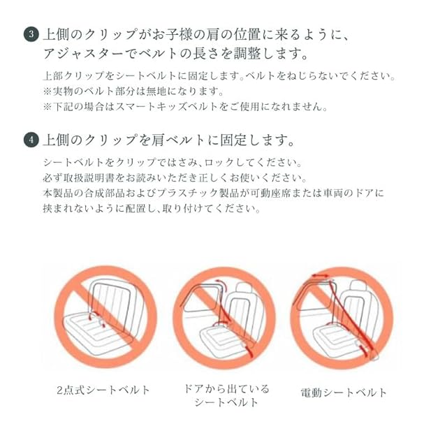 注意事項:ご使用の適応条件は、体重15kg以上から36kg以下のお子さまです。・日本国内で登録されている3点式シートベルトが装備された自動車の座席でご使用ください。・お子さまの安全のため、ご使用前に必ず説明書や公式動画をご確認いただき、ご使用方法など十分にご理解いただいた上で、正しくご使用ください。クリップはお子様がベルトを外さないように、衝撃時に簡単に外れないよう安全の為、硬めの仕様になっております。