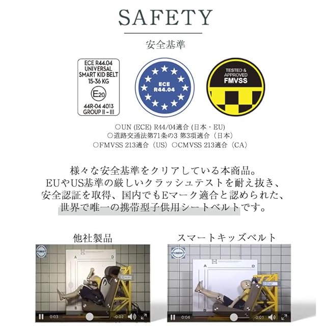安全基準:UN (ECE) R44/04適合 (日本・EU)、道路交通法第71条の3 第3項適合(日本)、FMVSS 213適合(US)、CMVSS 213適合(CA)、国内適合確認機関:警察庁 交通局 交通企画課、国土交通省 自動車局 審査・リコール課