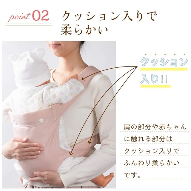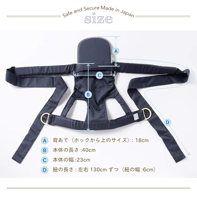 <カラー>ピンクベージュ/ブルーグレー/サンドベージュ/カーキ/ダークネイビー/ブラックの全6色。ベビーギフトショップオリジナルカラーです。<素材> 綿100% スポンジ部分:ウレタン <サイズ> フリー <使用月齢> *だっこ 首が座ってから(4ヶ月)~12ヶ月(体重:約10.2kg) *おんぶ 首が座ってから(4ヶ月)~30ヶ月(体重:約14.9kg) ※首の座らない乳児に使用しないでください。 <洗濯方法> 手洗い、陰干し、乾燥機使用不可 色落ちすることがありますので、他のものとは別に洗ってください。 洗剤によっては蛍光増白剤が移染することがあります。