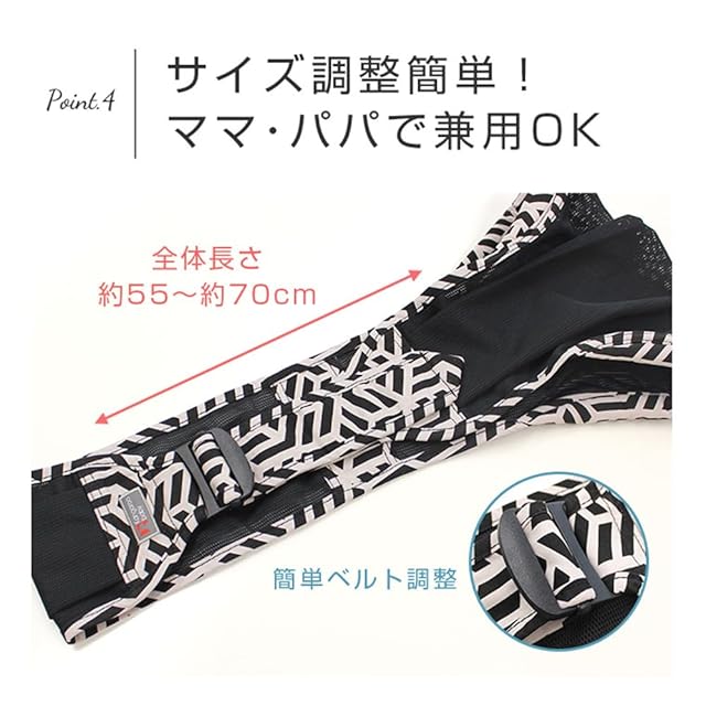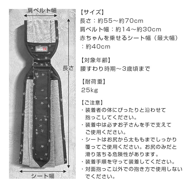 ✅【商品仕様】適用年齢:腰すわり時期~3歳頃まで・・・適用体重:25kg以内・・・商品重量:150g・・・肩紐長さ:調整可能約55~70cm・・・肩ベルト幅:約14~30cm。ママとパバが兼用できる片手抱っこ。