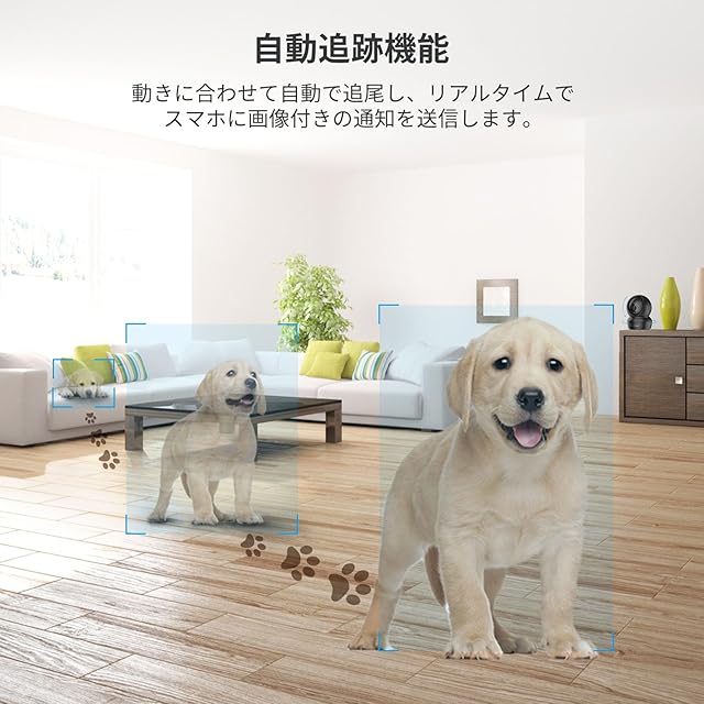 【自動追尾&広角首振り】 ペットの動きに合わせてカメラが自動で追尾。水を飲む、遊ぶ、寝る…すべての行動を広範囲でキャッチ。360°カバーで死角なし、監視カメラとしても心強い設計。