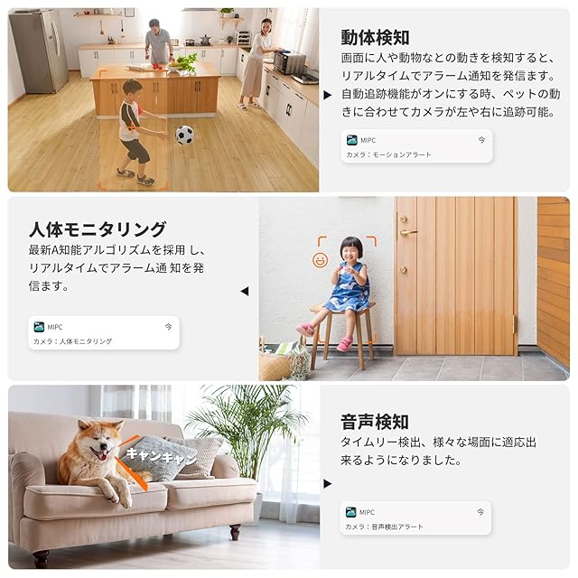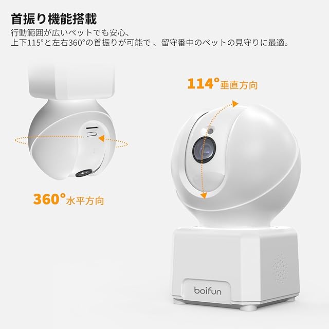 【知能警報音センサー&リアルタイム通知&alexa対応】 最先端AI技術により、無料の「mipc」アプリにて動体検知+人体認識+異常音検知+自動追尾+警報通知を自由にon/offできます。ペットがリビングで遊んでいる間、見守りカメラはペットの方向を捉えて自動的に360°(左右のみ)回転して記録できます。BOIFUN室内防犯カメラは警報音センサーが搭載しています。警報音センサーがオンにすると、不審者が検出してから警報音が鳴ります。不審者が侵入やすい窓周辺などの警戒に効果を発揮します。部屋に何か異常音や不審者なら、スマホにアラート通知を届きます。進化した監視カメラはAlexaやEcho showをサポートできます。このネットワークカメラは複数のユーザー共有をサポートしており、室内防犯カメラ一台で家族全員が一緒に家を見守ります!