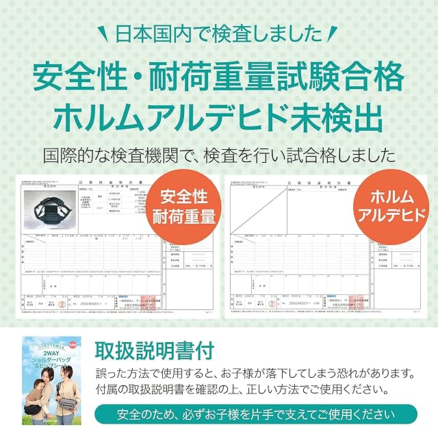 【安全性・耐荷重量試験合格】日本の検査機関で、安全性、耐荷重量の試験を行い合格しました。ヒップシートは、体重20kgまで(6ヶ月~4歳頃)の腰の座ったお子様が対象になります。安全性に十分配慮しながらご使用ください。