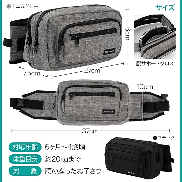 【商品仕様】○サイズ:バッグ部分横27cm×縦16cm×マチ7.5cm、肩パッド横37cm×幅10cm ○対応年齢:6ヶ月~4歳頃 ○耐荷量:約20kg ○素材:ポリエステル ○カラー:ブラック、デニムグレー ○ご注意:安全のため、腰サポートクロス使用、未使用に関わらず、必ずお子様を片手で支えてご使用ください ○ブランド:Plaisiureux(プレジュール)