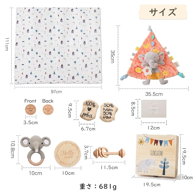 【ギフトセット内容】ベビーマンスリーカード*1 、幼児ソックス*1、グリーティングカード*1、デシジョンコイン*1、ぬいぐるみ付きタオル*1、針編みガラガラ*1、ベビーバスタオル*1、木製ガラガラ*1、収納用箱*1。赤ちゃんに優しい素材を使用しているので、安心して使えます。出産のお祝いなど大切なシーンの贈り物にぴったりです。