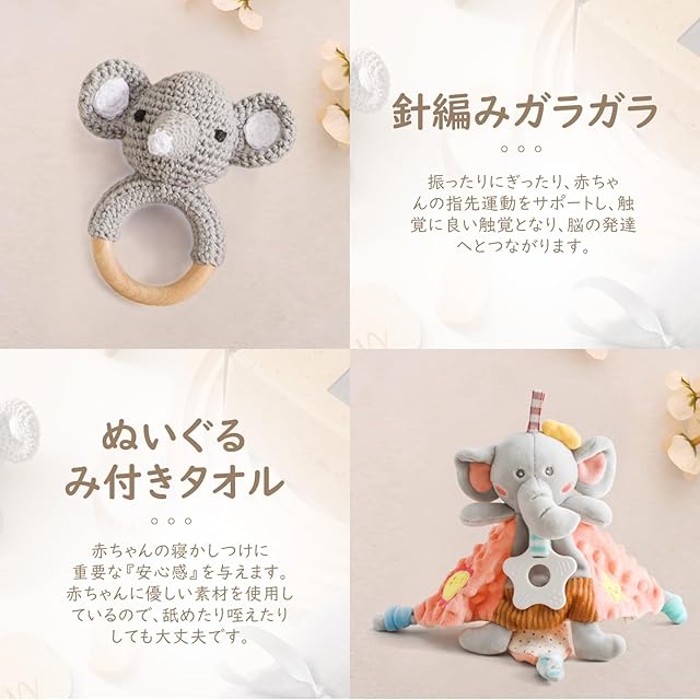 【ガラガラセット】木製ガラガラと針編みガラガラがあります。かわいい形の手持ちベルは、赤ちゃんの指の敏捷性を訓練できるだけではなく、赤ちゃんの注意を吸引することで、視覚と聴覚の発展を刺激できます。