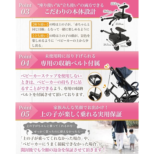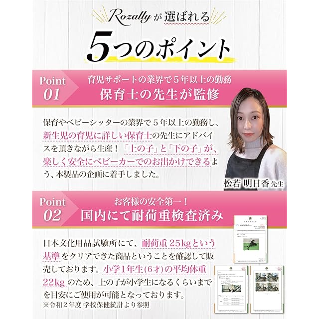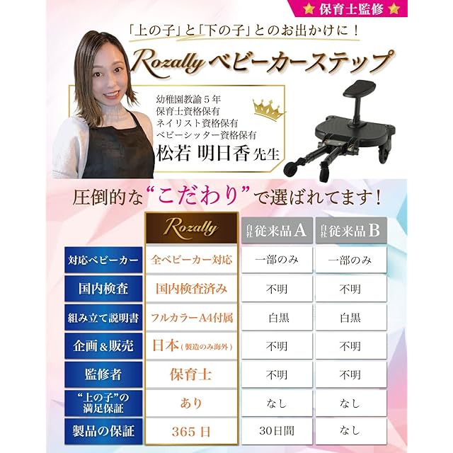 【保育士が監修】 Rozally ベビーカーステップ がついに正式販売開始。下の子 が生まれたから ベビーカー で お出かけ という時に 上の子 が自分もベビーカーに乗りたいと喧嘩になってしまった…という声から生まれた バギー ボード 型の 接続 ステップになります。サドル付き の ステップボード になっているので 上の子 も一緒に 座れる モデルになっています。企画&設計では【保育士】の先生からアドバイスをもらい、分かりやすい取扱説明書を添えて製品化しました。