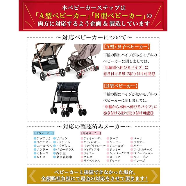 【全ベビーカーに対応】各メーカーから 二人乗り の 取り付け アダプタ として純正品の オプションボード として販売されている場合もありますが、補助ペダル がしっかりしていなかったり、サドル が付いていなかったりとバラバラな仕上がりになっています。Rozally ベビーカーステップ は、全モデル対応はもちろん、機能性もこだわりを持ってベビーカーステップの機能性に特化して製品化しました。 ※組み立ての前に付属の説明書を読んでください。