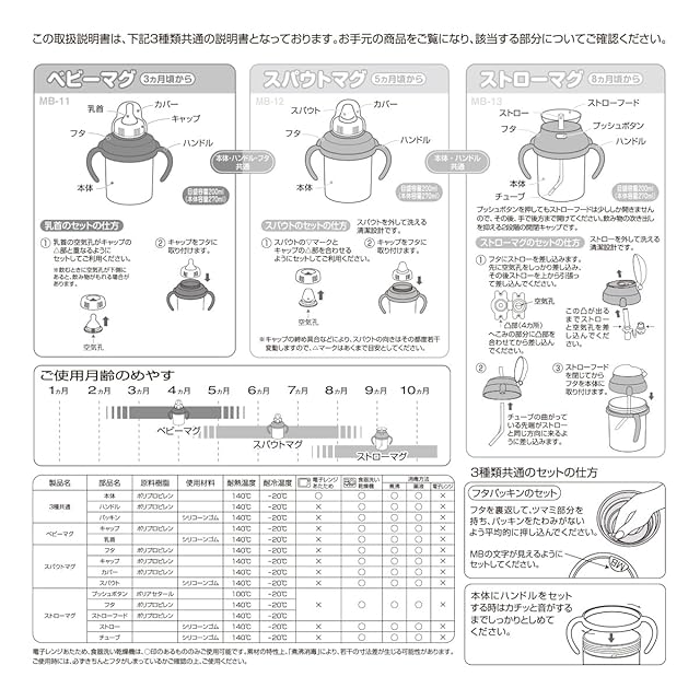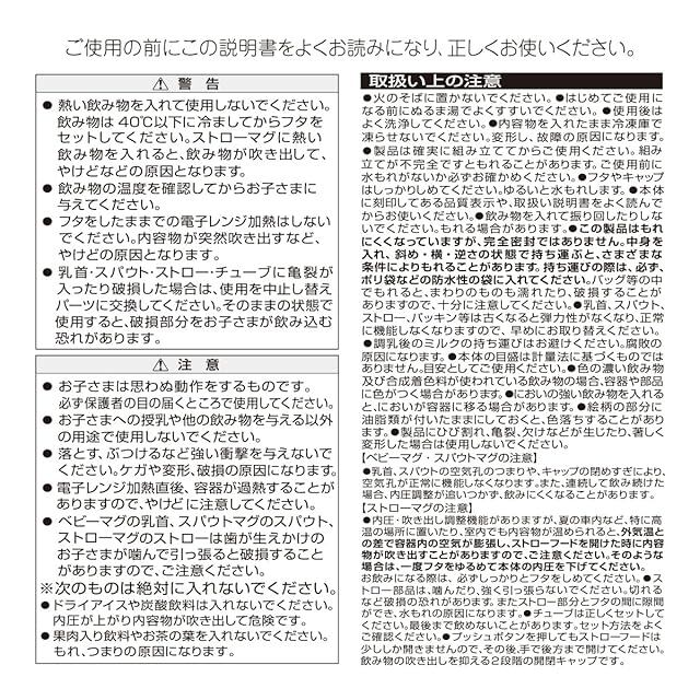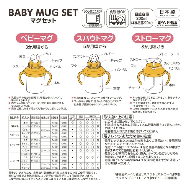 仕様:BPA FREE(ビスフェノールA 不使用)●容量:270ml・ベビーマグ(乳首口):φ47×H45mm・スパウトマグ(マグ本体):φ81×W120×H158mm・ストローマグ(ストロー口):φ79×W90×H47mm