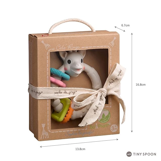 【特徴】100%天然ゴムと食用塗料でできた、カラフルなティージングリングです。ソフィーの口、角、耳、リングなどいろいろな形の部分を噛むことができるので、歯が生えるむずがゆい時期に歯茎をマッサージします。安心な素材なので赤ちゃんの出産祝いにも最適です。カラフルなリングの部分の色が赤ちゃんの目の成長にも働きかけます。軽くて持ちやすく小さな赤ちゃんの手にも握りやすくなっています。